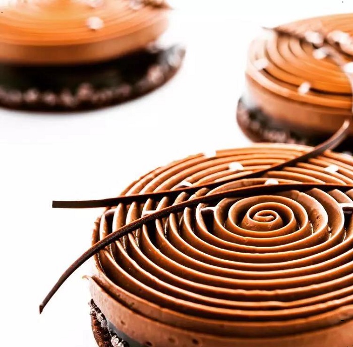 圖片中的那些旋渦一樣的裝飾就是“陀飛輪”(le tourbillon)技術(shù)了。這種裝飾技術(shù)在中國的甜品制作領(lǐng)域也廣為人知,并且迅速風(fēng)靡全世界,而它的創(chuàng)始人就是我們今天的主角,于2011年獲得法國甜品及糕點(diǎn)MOF的Yann Brys!