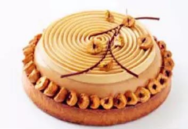 混合糖粉,榛子粉,淀粉,蛋黃和蛋白(1)。將蛋白(2)和糖打發(fā),加入之前的混合物,然后加入焦化黃油和花蜜。把面團(tuán)鋪在墊有硅膠烤墊的烤盤上,稱1400克。入爐168攝氏度烤14分鐘左右。完成后切成直徑16厘米的圓餅。放入撻皮內(nèi)。