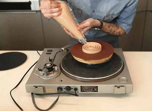 用砂糖制作焦糖,再用加熱的奶油牛奶來稀釋。倒在金色巧克力上,攪勻。加入浸泡過香草莢的鮮奶油(2)和融化的馬斯卡彭奶酪。攪勻,4攝氏度下保存2小時(shí)。放入廚師機(jī)打發(fā),然后利用“唱片機(jī)(裱花轉(zhuǎn)盤)”在淋過面的焦糖榛子奶油上進(jìn)行”陀飛輪“裱花。